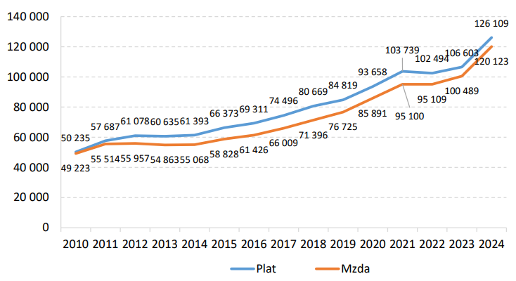 Zatímco v roce 2023 činil průměrný plat lékaře (včetně zubních lékařů) 106 603 korun a mzda 100 489 korun (plat pobírají zaměstnanci ve veřejném sektoru, mzdu v soukromém sektoru, pozn. red.), o rok později se tyto hodnoty vyšplhaly na 126 109 a 120 123 korun. Znamená to meziroční nárůst téměř o 20 tisíc korun, tedy přibližně o pětinu. V dlouhodobém horizontu je posun ještě markantnější. V roce 2010 brali lékaři v průměru kolem 50 tisíc korun, dnes je to tedy více než dvojnásobek.