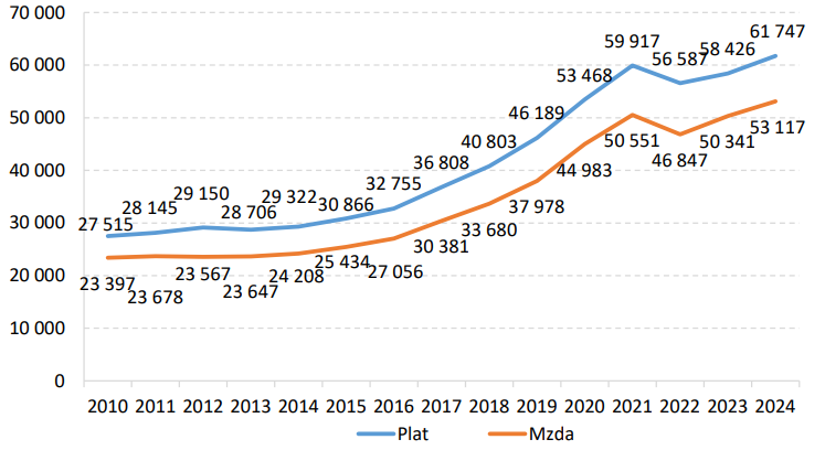 Z celkových čísel vyplývá, že průměrná hrubá mzda či plat ve zdravotnictví v roce 2024 činily 56 870 korun, což je o 4 442 korun více než v roce předchozím. V procentuálním vyjádření jde o 8% nárůst.