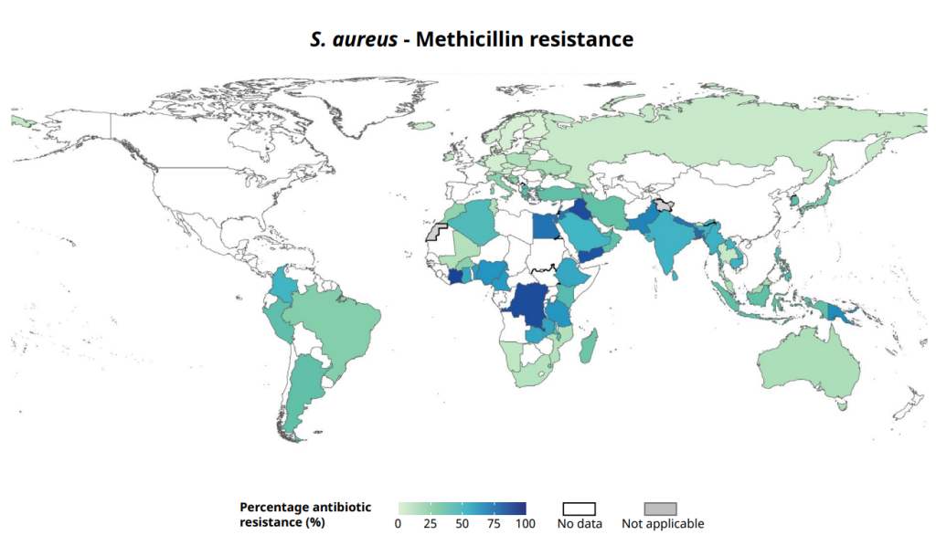 Problém představuje také zlatý stafylokok rezistentní vůči methicilinu (MRSA), který stojí za 27 % těchto infekcí. Vůbec nejčastější je ve východním Středomoří, kde způsobuje celou polovinu nákaz.