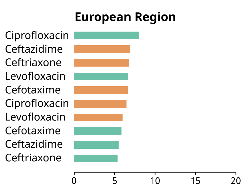 Výskyt bakterií rezistentních na antibiotika u infekcí krevního řečiště v evropském regionu (v procentech).