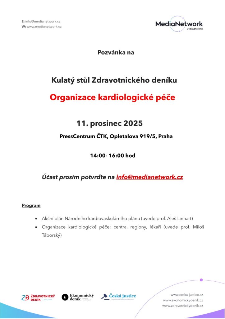 Vše podstatné, co se v kardiologii děje a uděje, zmapuje kulatý stůl Zdravotnického deníku Organizace kardiologické péče. S aktuálními přednáškami na něm vystoupí špičky oboru, následovat bude i diskuse se zástupci plátců a politiků. Na akci, která proběhne ve čtvrtek 11. prosince odpoledne v pražském PressCentru ČTK, se můžete registrovat na e-mailu [email protected].