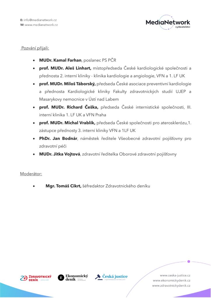 V následné diskusi vystoupí i další experti – předseda České internistické společnosti profesor Richard Češka a předseda České společnosti pro aterosklerózu profesor Michal Vrablík.