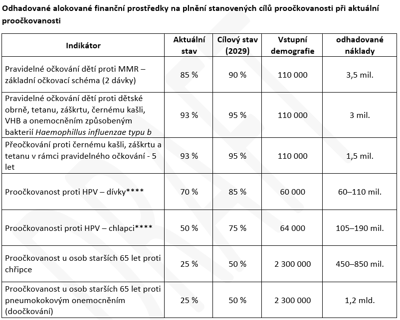 Očkovací strategie stanovuje cíle v oblasti očkování do roku 2030. Zároveň vyčísluje, jaké náklady si jejich naplňování vyžádá. Podle verze strategie, která vzešla z vnitřního připomínkového řízení, bude implementace stát cca 170 milionů korun. Další finance pak budou třeba na úhradu samotného očkování.