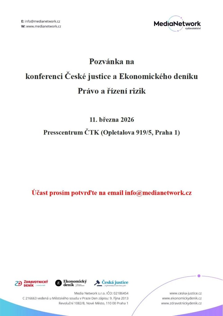 Konference Právo a řízení rizik propojí regulátory, zástupce pojišťoven, právní experty i specialisty na řízení rizik a nabídne prostor pro otevřenou debatu o budoucnosti sektoru. Pokud vás zajímá, kudy se ubírá odpovědnost a řízení rizik v nemocnicích a dalších zdravotnických zařízeních a jak legislativní změny ovlivní fungování pojišťovnictví, přijďte 11. března do PressCentra ČTK (Opletalova 919/5, Praha 1).