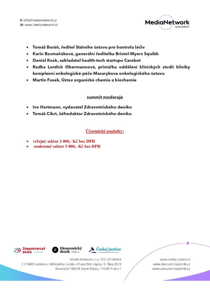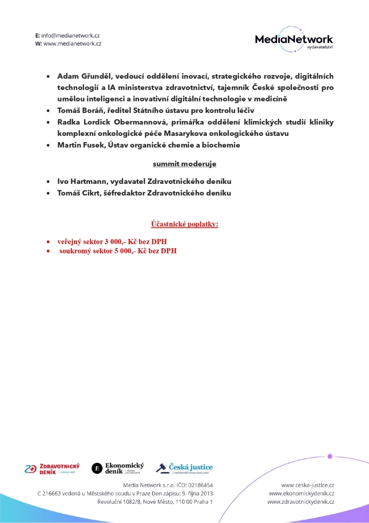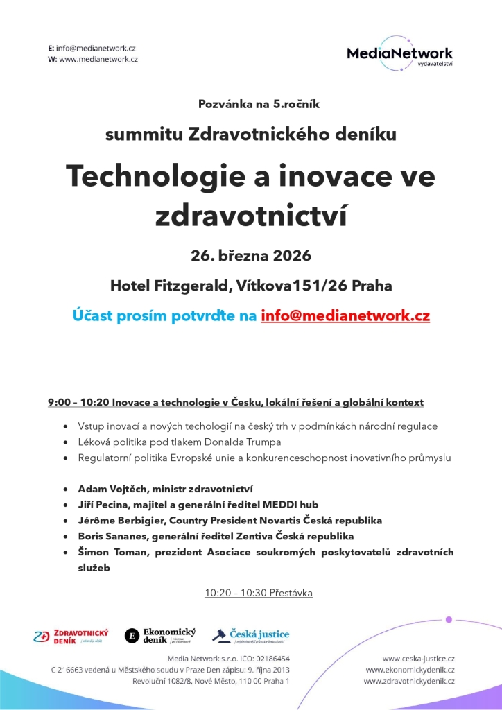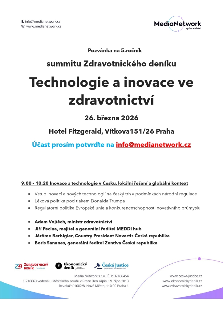 Celodenní summit, kterým vás provedou vydavatel Zdravotnického deníku Ivo Hartmann a šéfredaktor Tomáš Cikrt, se uskuteční v prostorách Hotelu Fitzgerald (Vítkova 151/26, Praha).
