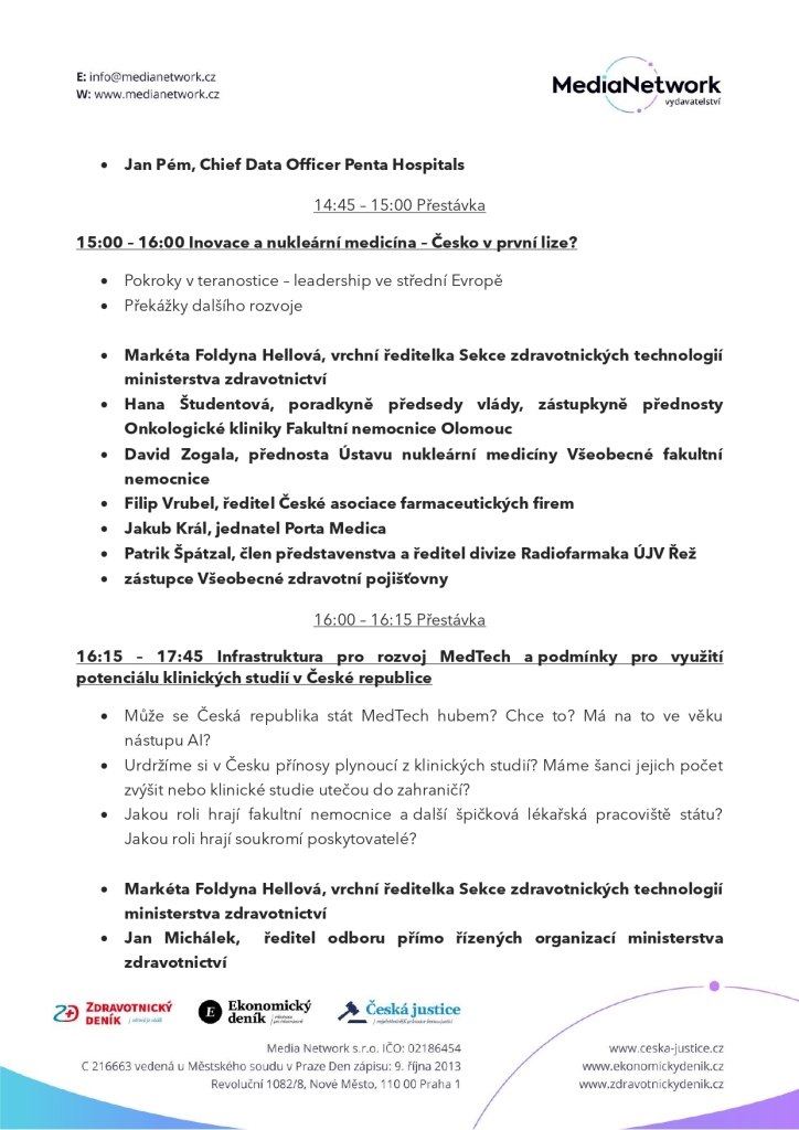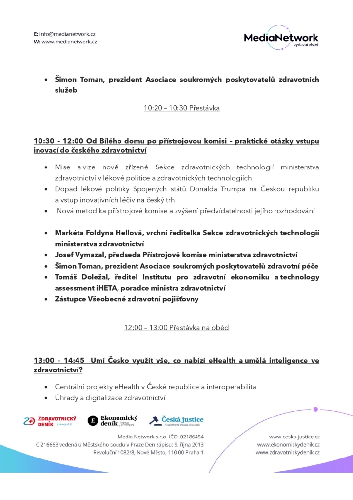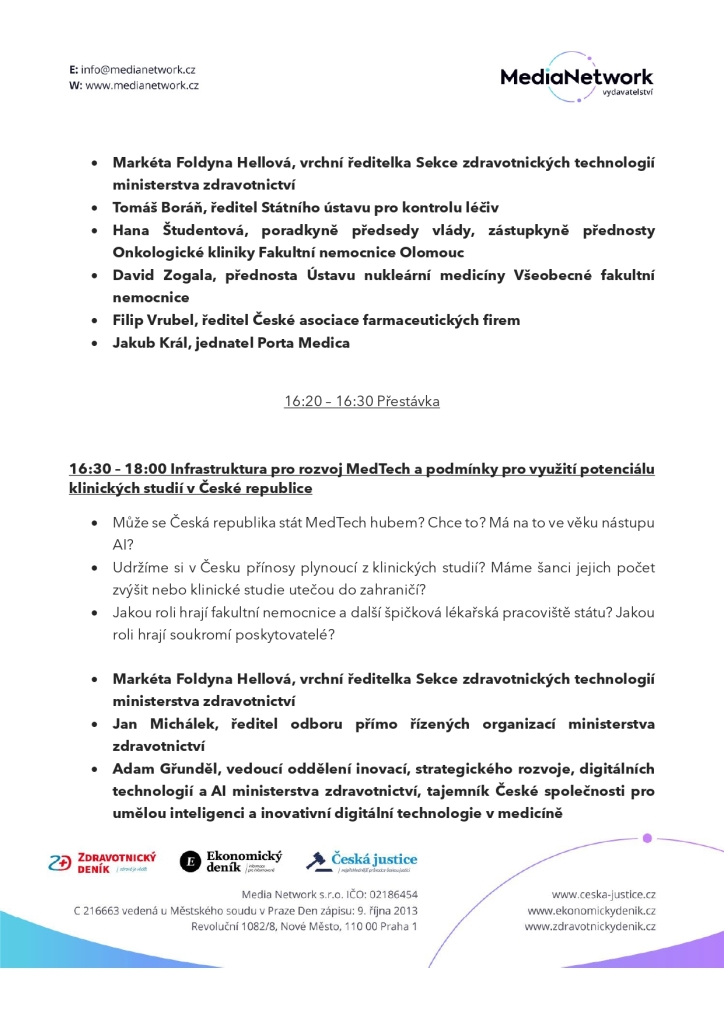 Pohled průmyslu a soukromého sektoru přinesou osobnosti jako Jérôme Berbigier (Novartis), Boris Sananes (Zentiva) nebo Jiří Pecina (MEDDI hub). Tématem bude nejen ekonomická konkurenceschopnost, ale i praktické otázky fungování přístrojové komise pod vedením jejího předsedy Josefa Vymazala.