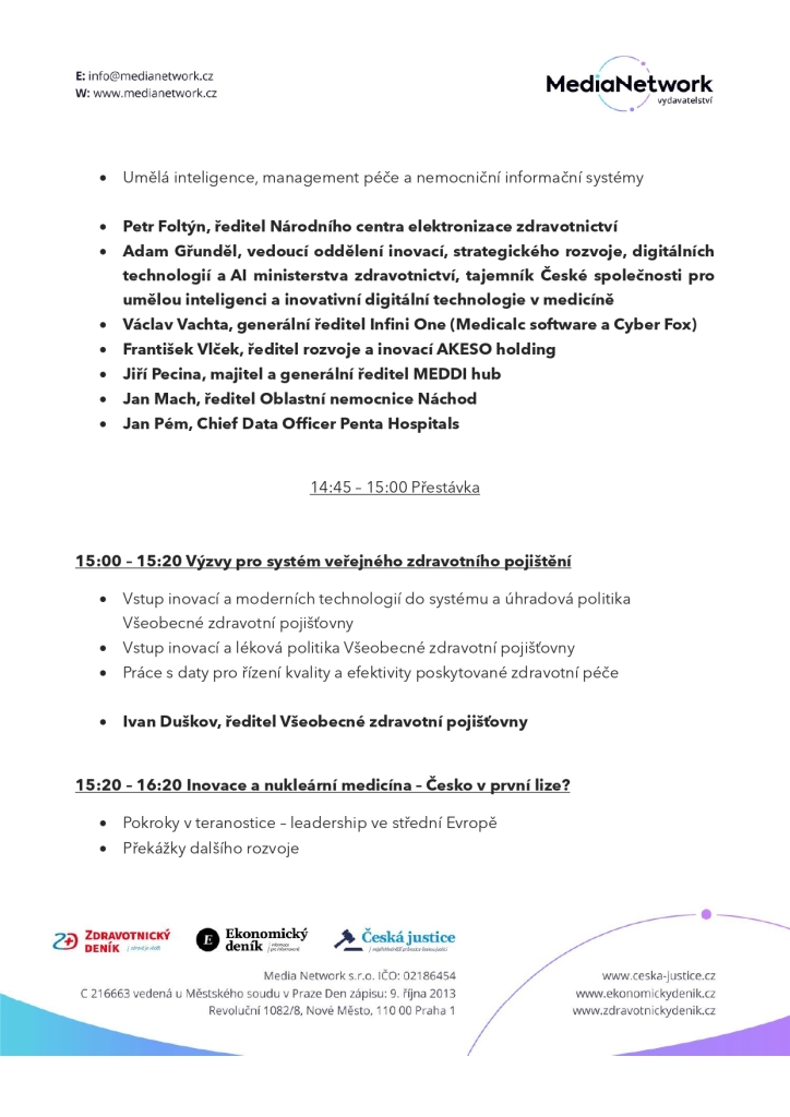 Účastníky čeká maraton diskusí s lidmi, kteří přímo ovlivňují podobu českého systému. Do diskuze o strategickém pohledu na inovace v Česku i globálním kontextu se zapojí ministr zdravotnictví Adam Vojtěch. O tom, jak dostat nové technologie do praxe, budou diskutovat ředitel Všeobecné zdravotní pojišťovny Ivan Duškov a vrchní ředitelka nově zřízené Sekce zdravotnických technologií ministerstva zdravotnictví Markéta Foldyna Hellová. Ředitel VZP zároveň pohovoří o současných výzvách pro systém veřejného zdravotního pojištění.