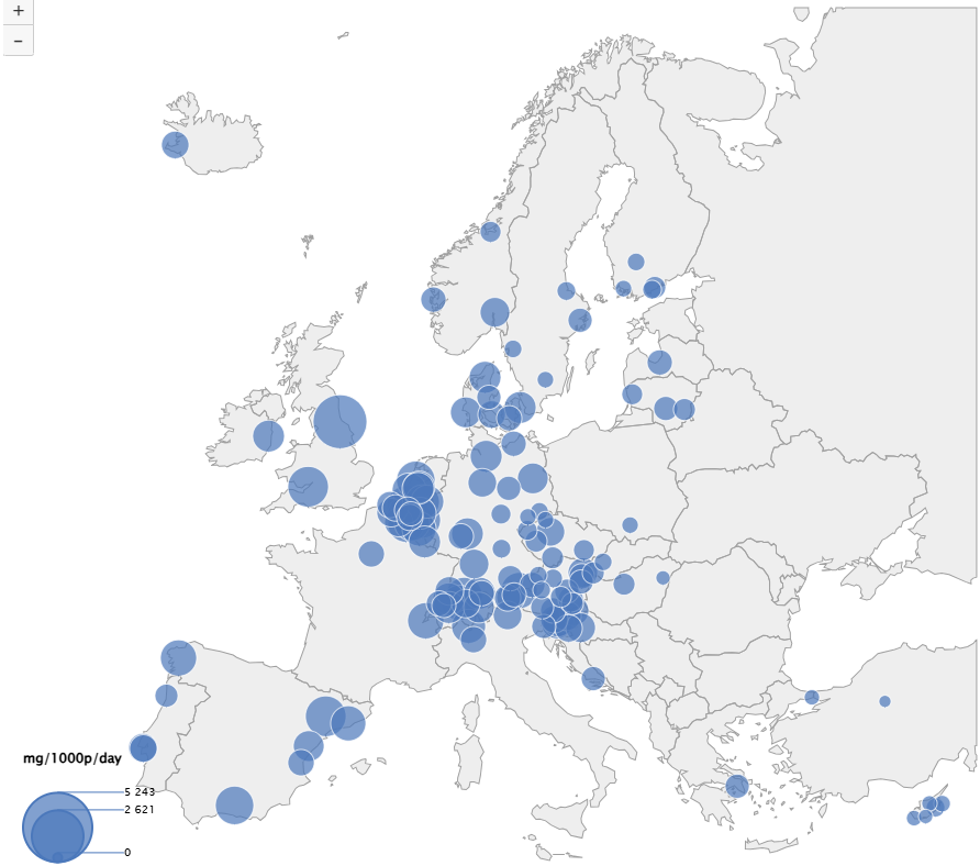 Detekce kokainu zůstává nejvyšší v západoevropských a jihoevropských městech, zejména v Belgii, Španělsku a Nizozemsku. Z globálního hlediska se ovšem hladiny naměřené v Kanadě, Chile, Švýcarsku a Spojeném království shodovaly nebo překračovaly nejvyšší hladiny zaznamenané v Evropě.