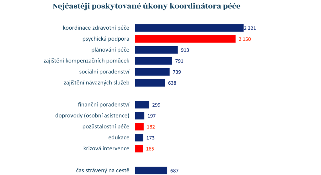 Červeně jsou vyznačeny úkony, které činí práci koordinátorů pečujících o děti s vážným onemocněním mimořádně náročnou a kladou na ně mimořádné požadavky.