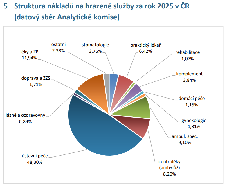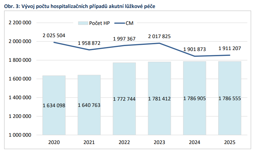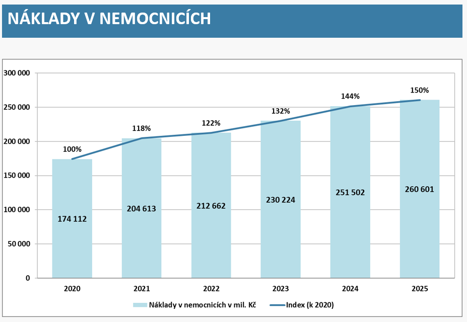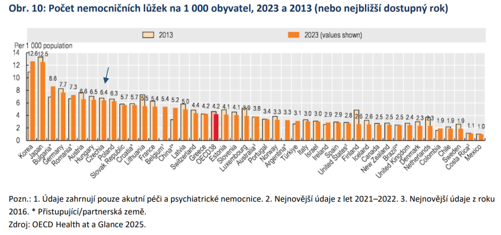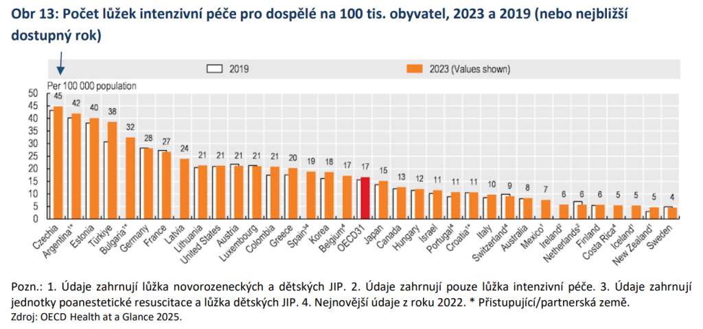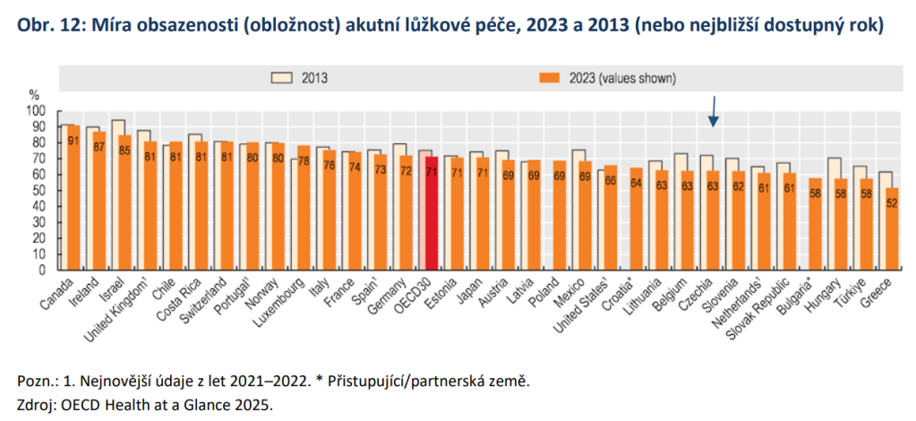 „Česko se dlouhodobě řadí mezi země OECD s nejvyšší kapacitou nemocničních lůžek v přepočtu na obyvatele. Vyznačuje se také velmi hustou nemocniční sítí. Více než 98 % obyvatel venkovských oblastí má dostupnou nemocnici do 45 minut jízdy autem. Průměrná obložnost akutní lůžkové péče v Česku byla v roce 2023 na úrovni 63 %, což je výrazně pod průměrem zemí OECD (71 %). Zároveň má Česko – v porovnání se všemi státy OECD – nejvyšší počet lůžek intenzivní péče pro dospělé v přepočtu na počet obyvatel,“ popisuje zpráva analytické komise místa, kde můžeme zvyšovat efektivitu.