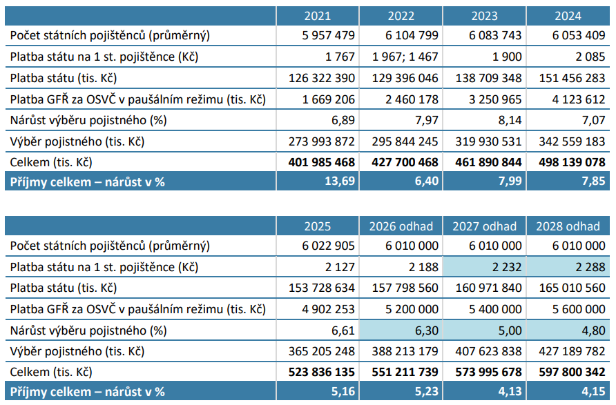 Pro příští rok (když nepočítáme se zamýšlenou změnou mechanismu plateb za státní pojištěnce) odhadují zdravotní pojišťovny příjmy systému ve výši 574 miliard, což by mělo být o 4,13 % víc než letos. V roce 2028 by to pak mělo být 598 miliardy, jde tedy meziroční nárůst o 4,15 %.