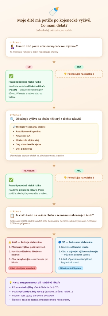 Pokud má vaše dítě zdravotní potíže, měli byste si jako první zodpovědět otázku: Krmíte ho výhradně umělou kojeneckou výživou? Je-li vaše odpověď kladná, zkontrolujte složení výrobku. Pokud obsahuje arachidonovou kyselinu nebo některé oleje (viz obrázek na konci článku), zkontrolujte číslo šarže (LOT) na obalu.