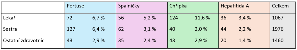 V Olomouci vzorně vedou i statistiky proočkovanosti svých zaměstnanců. Tu si můžete prohlédnout v následující tabulce (očkování proti spalničkám zahrnuje i povinně očkované zdravotníky oddělení kožního a infekčního):