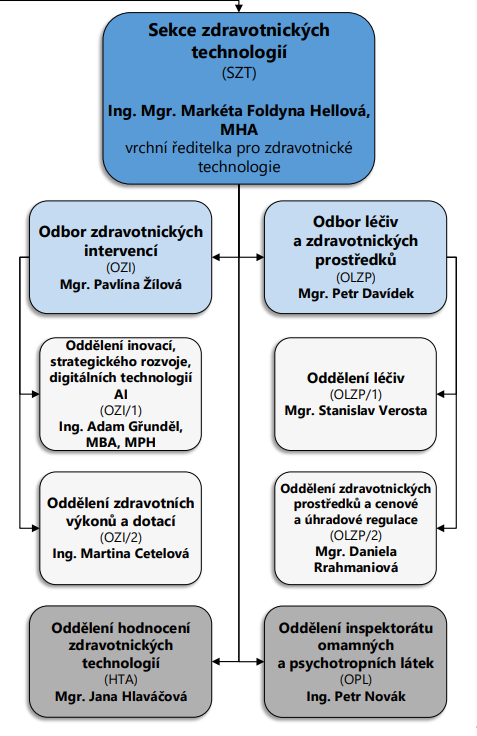 Kdo má co v nové sekci na starosti? Seznam zdravotních výkonů, inovace a umělou inteligenci má pod sebou odbor zdravotnických intervencí. Vydávání a správu seznamu zdravotních výkonů včetně pracovní skupiny, která k němu zasedá, a také regulaci cen výkonů řeší oddělení zdravotních výkonů a dotací.